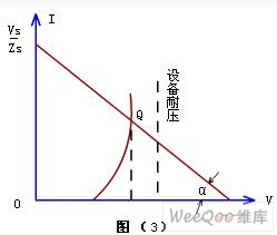 壓敏電阻的Zv與電路總阻抗(包括浪涌源阻抗Zs)構(gòu)成分壓器,因此壓敏電阻的限制電壓為V=VsZv/(Zs+Zv)。Zv的阻值可以從正常時(shí)的兆歐級(jí)降到幾歐,甚至小于1Ω。由此可見(jiàn)Zv在瞬間流過(guò)很大的電流,過(guò)電壓大部分降落在Zs上,而用電器的輸入電壓比較穩(wěn)定,因而能起到的保護(hù)作用。圖(3)所示特性曲線可以說(shuō)明其保護(hù)原理。直線段是總阻抗Zs,曲線是壓敏電阻的特性曲線,兩者相交于點(diǎn)Q,即保護(hù)工作點(diǎn),對(duì)應(yīng)的限制電壓為V,它是使用了壓敏電阻后加在用電器上的工作電壓。Vs為浪涌電壓,它已超過(guò)了用電器的耐壓值VL,加上壓敏電阻后,用電器的工作電壓V小于耐壓值VL,從而有效地保護(hù)了用電器。不同的線路阻抗具有不同的保護(hù)特性,從保護(hù)效果來(lái)看,Zs越大,其保護(hù)效果就越好,若Zs=0,即電路阻抗為零,壓敏電阻就不起保護(hù)作用了。圖(4)所描述的曲線可以說(shuō)明Zs與保護(hù)特性之間的關(guān)系。