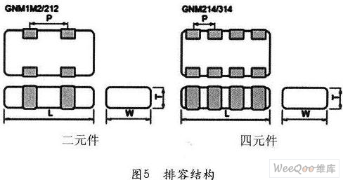 村田制作所還生產(chǎn)一種排容,在一個(gè)器件中有2至4個(gè)電容,尤其適合在單片機(jī)的總線上使用,見(jiàn)圖5。