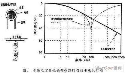 2)片式三端電容器 我們平常使用的陶瓷圓片電容器作為旁路電容,可以將高頻干擾短路到地,達(dá)到抗干擾的目的。但是電容器的引線電感及電容內(nèi)部的剩余電感卻限制了它的高頻特性發(fā)揮。圖6是普通電容器做高頻旁路時(shí)的引線電感影響例。