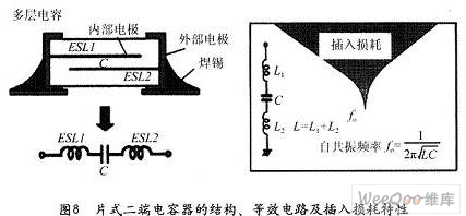 應(yīng)該說(shuō)片式二端電容器的出現(xiàn)對(duì)于改進(jìn)普通引線式電容器的自諧振問(wèn)題是很有好處的,因?yàn)槠蕉穗娙萜鞯囊€長(zhǎng)度得到了最大限度縮減。但由于電容器內(nèi)部的構(gòu)造,并不能夠消除內(nèi)部電極的殘留電感,這樣當(dāng)頻率達(dá)到使電容器的容抗XC同殘留電感的XL的絕對(duì)值相等時(shí),二端電容依然會(huì)產(chǎn)生自諧振,參見(jiàn)圖8。由于自諧振頻率的存在,當(dāng)噪聲的頻帶超過(guò)自諧振頻率之后,噪聲的抑制效果會(huì)急速下降。但是與普通有引線的二端電容相比較,還是有很大改進(jìn)。