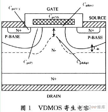 1 基本原理 功率VDMOS的開關(guān)特性是由其本征電容和寄生電容來決定的。VDMOS的電容主要由三個部分柵源電容Cgs柵漏電容Cgd以及源漏電容Cds組成,如圖1所示。電容的充放電是限制其開關(guān)速度的主要因素。柵源之間的電容是由三個部分組成,即: Cgs=Cgs(N+)+Cgs(P)+Cgs(M) Cgs(N+)是柵源交疊電容;Cgs(M)是柵與源金屬間的電容;Cgs(P)是柵與P-base之間的電容。這三個電容的大小都是由VDMOS本身設(shè)計上的參數(shù)決定的,最主要取決于介質(zhì)層的厚度。