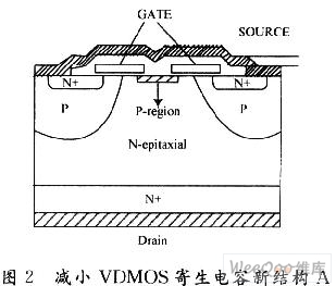 2 新結(jié)構(gòu)的提出 根據(jù)上面對VDMOS電容的分析,提出一種新的結(jié)構(gòu)以減少器件的寄生電容。由分析可得出,柵下耗盡層的形狀對VDMOS電容有較大影響,最主要影響Cgd。