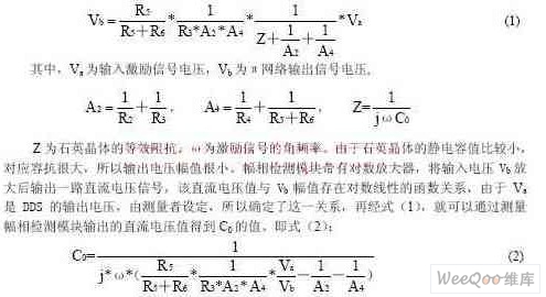 2.4 基于π網(wǎng)絡(luò)的靜電容測(cè)量方法 利用DDS(直接數(shù)字頻率合成)信號(hào)源作為激勵(lì)源,其輸出交流信號(hào)頻率遠(yuǎn)離石英晶體諧振頻率,該信號(hào)激勵(lì)接有被測(cè)石英晶體的π網(wǎng)絡(luò)。此時(shí),石英晶體等效于一個(gè)值為C0的電容。π網(wǎng)絡(luò)的輸出電壓與該電容存在一定的函數(shù)關(guān)系,由于輸入電壓和π網(wǎng)絡(luò)的參數(shù)已知,測(cè)量輸出電壓并根據(jù)這一函數(shù)關(guān)系,可以計(jì)算出C0值。這種方法與測(cè)石英晶體諧振頻率的方法很相似,都需要利用DDS輸出信號(hào)作為激勵(lì)信號(hào)并檢測(cè)π網(wǎng)絡(luò)輸出的矢量電壓。兩者區(qū)別在于測(cè)量諧振頻率要求檢測(cè)輸入電壓和輸出電壓之間相位差,而測(cè)量靜電容則要求測(cè)量輸入電壓和輸出電壓的幅值。因此,對(duì)這兩個(gè)矢量電壓信號(hào)采用幅相檢測(cè)的辦法可以使測(cè)量石英晶體的諧振頻率和靜電容統(tǒng)一起來。