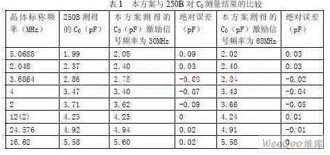 4. 實(shí)驗(yàn)數(shù)據(jù)與處理 以S&A公司的250B作為標(biāo)準(zhǔn)儀器,將采用本方案所測(cè)得的C0值與250B的測(cè)量結(jié)果進(jìn)行比對(duì),檢驗(yàn)測(cè)量精度是否滿足工業(yè)生產(chǎn)要求。在工業(yè)生產(chǎn)中,要求石英晶體靜電容的測(cè)量范圍為1~10pF,測(cè)量誤差小于0.1pF。實(shí)驗(yàn)數(shù)據(jù)如表1所示:
