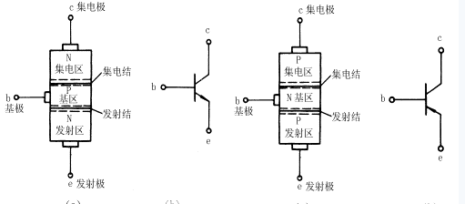 導體二極管內部只有一個PN結,若在半導體二極管P型半導體的旁邊,再加上一塊N型半導體如圖5-1(a)所示。由圖5-1(a)可見,這種結構的器件內部有兩個PN結,且N型半導體和P型半導體交錯排列形成三個區(qū),分別稱為發(fā)射區(qū),基區(qū)和集電區(qū)。從三個區(qū)引出的引腳分別稱為發(fā)射極,基極和集電極,用符號e、b、c來表示。處在發(fā)射區(qū)和基區(qū)交界處的PN結稱為發(fā)射結;處在基區(qū)和集電區(qū)交界處的PN結稱為集電結。具有這種結構特性的器件稱為三極管。