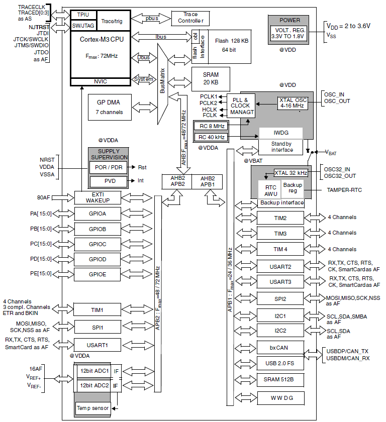 STM32F103xx中密度性能線系列集成了高性能ARM® Cortex®-M3 32位RISC內(nèi)核,工作頻率為72 MHz,具有高速嵌入式存儲(chǔ)器(閃存高達(dá)128 KB,SRAM高達(dá)20 KB),以及大量連接到兩條APB總線的增強(qiáng)型I/O和外設(shè)。所有器件都提供兩個(gè)12位ADC,三個(gè)通用的16位定時(shí)器和一個(gè)PWM定時(shí)器,以及標(biāo)準(zhǔn)和先進(jìn)的通信接口:多達(dá)兩個(gè)I2C和SPI,三個(gè)USART,一個(gè)USB和一個(gè)CAN。