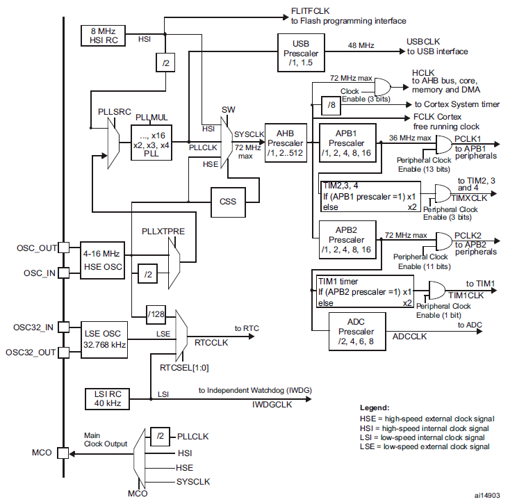 1. 當(dāng)HSI被用作PLL時(shí)鐘輸入時(shí),可實(shí)現(xiàn)的最大系統(tǒng)時(shí)鐘頻率為64MHz。
