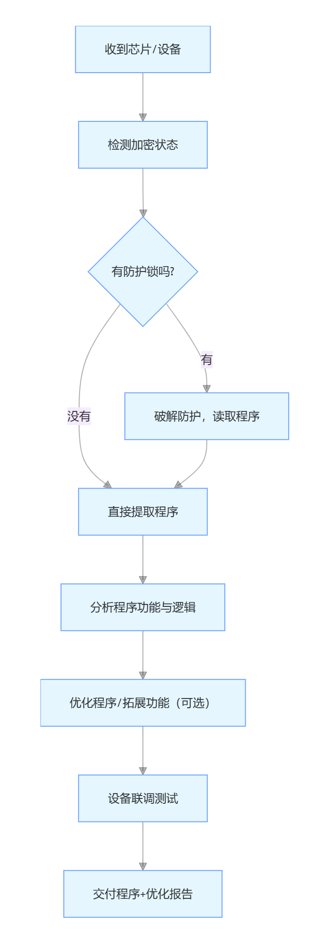 1. 服務(wù)全鏈條:從解密、程序修改到設(shè)備實(shí)測試,一站式搞定,不用企業(yè)對接多家服務(wù)商,省時(shí)省力。?